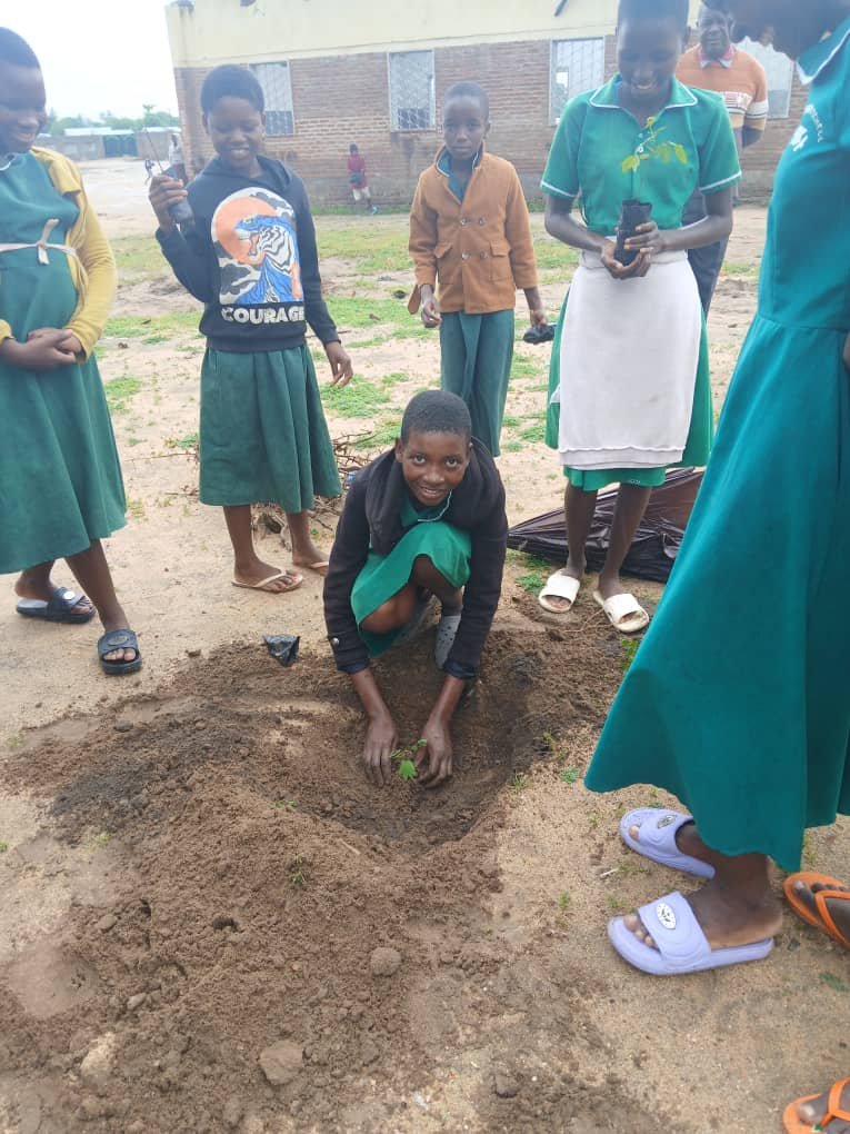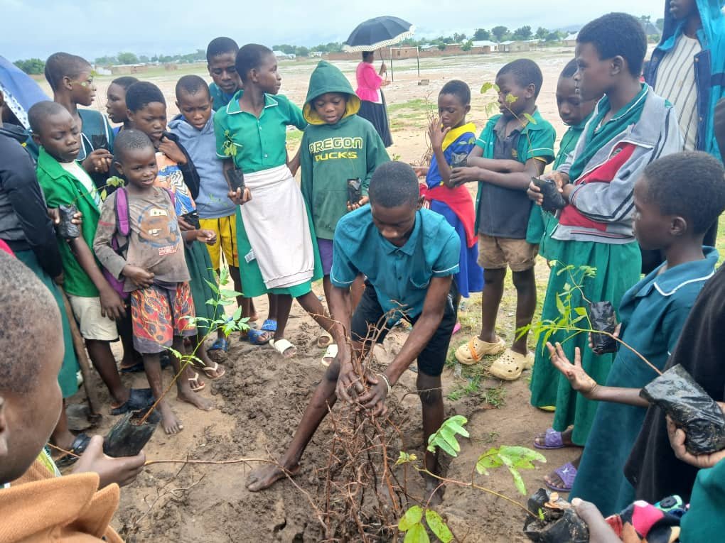 Primary School Children trained in tree nursery establishment and management. In this picture, primary school children are transplanting tree seedlings from the main nursery to the fields around their school in Blantyre Rural.